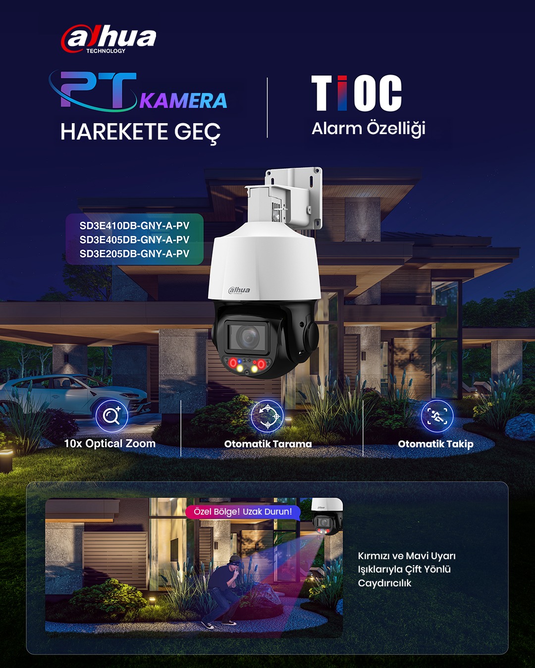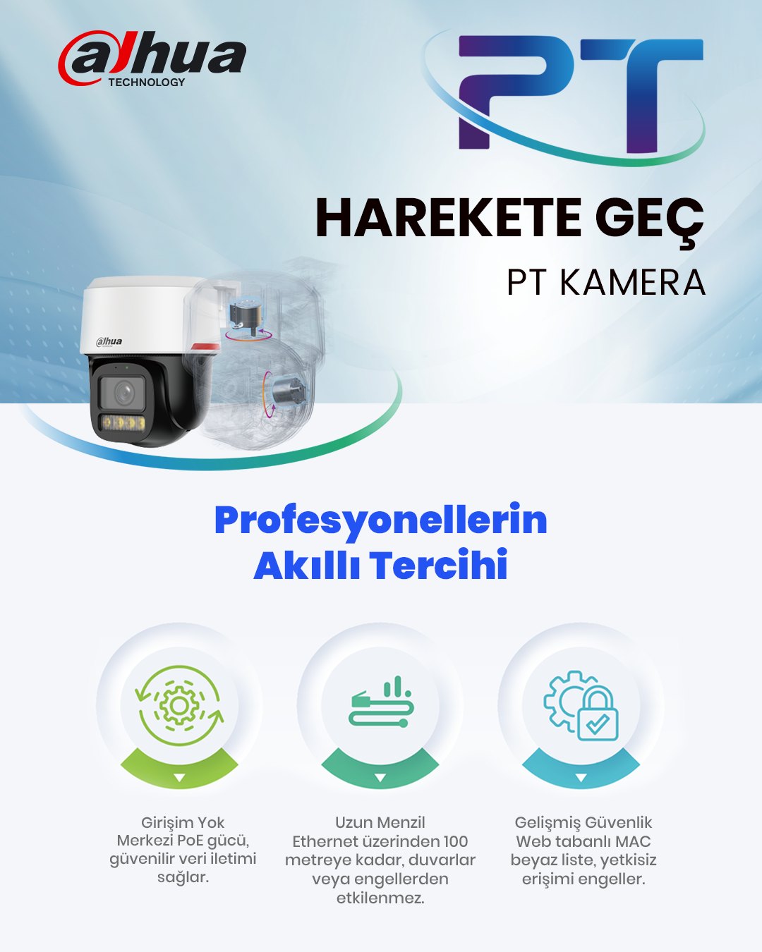 PT kameralar, Pan-Tilt (Yatay/Dikey Hareket) özelliği sayesinde farklı açılardan geniş alanları kolayca izleyebilmenizi sağlar.